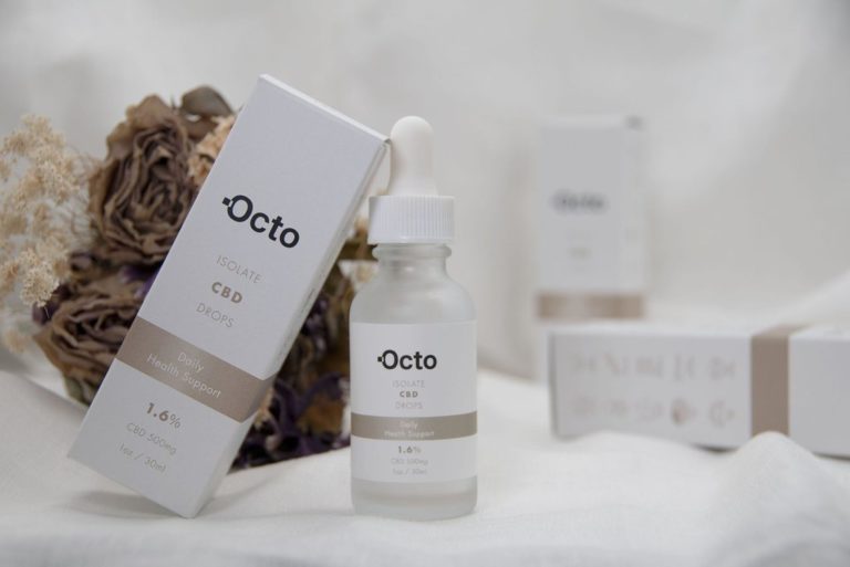 一般的に黒や青の容器が多いCBDオイルですが、Octoはすりガラス調の容器と、ベージュ・白を基調としたシンプルなパッケージデザインがポイント。女性のインテリアにも馴染みやすくなっています。